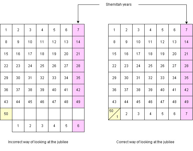 - In the 1st graph Jubilees are every 50 years so would be year 50, 100, 150, 200, 250, etc. I don't believe this is correct since it would disagree with Leviticus 25:3-4 which says for 6 years sow your field and in the 7th year let it rest (the Shemitah year). This would mean that year 49 would be a Shemitah year but then year 6 (not 7) would have to be the next Shemitah. This means every 50 years the Shemitah year would change from year 7 to year 6 to year 5 etc to year 1 before it would finally go back to year 7. This makes no sense.